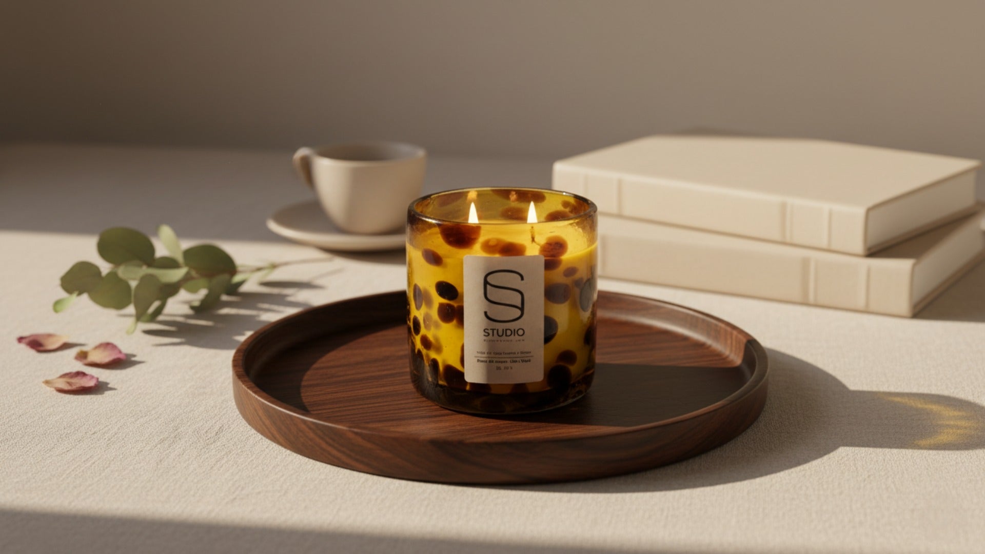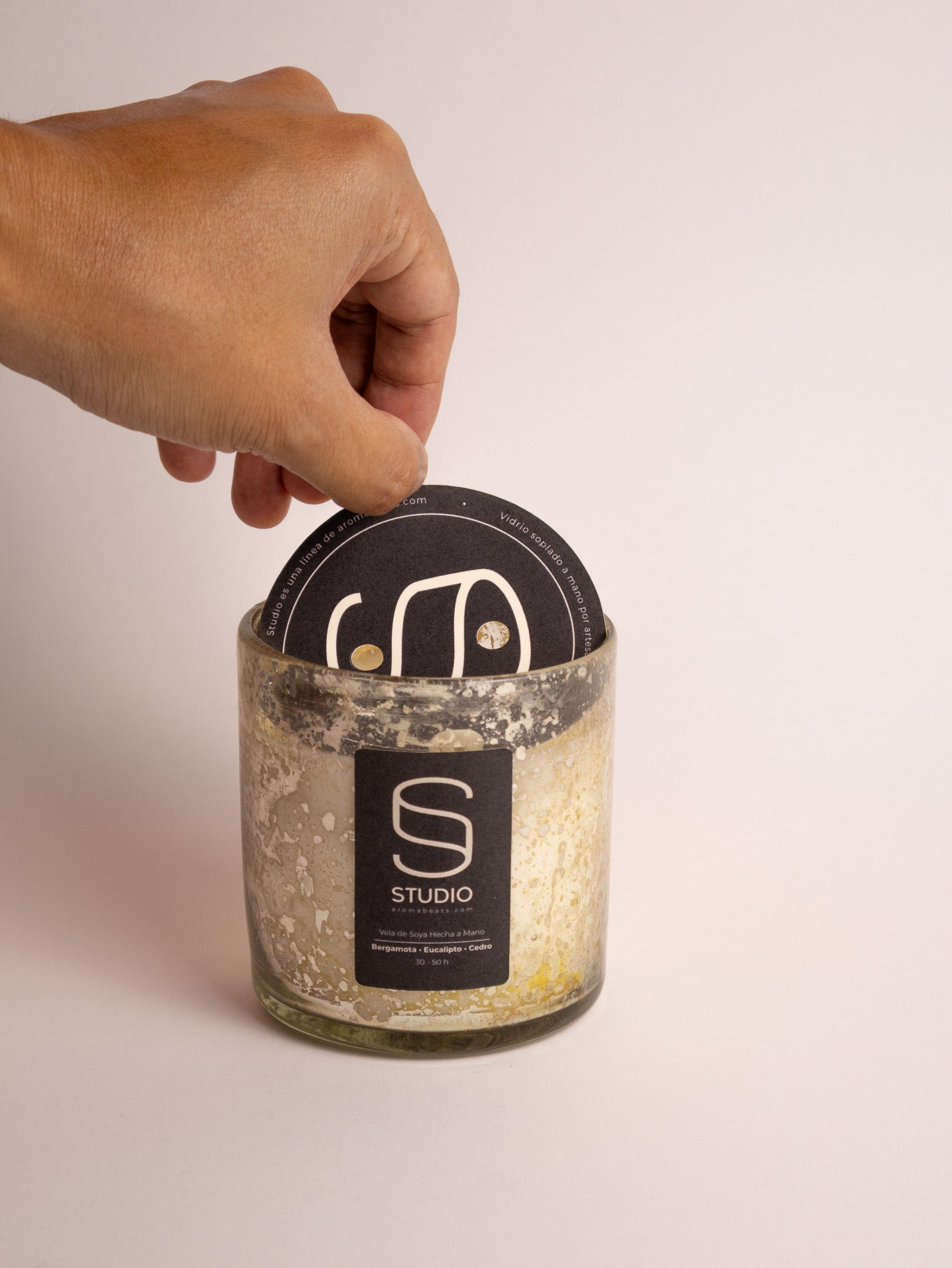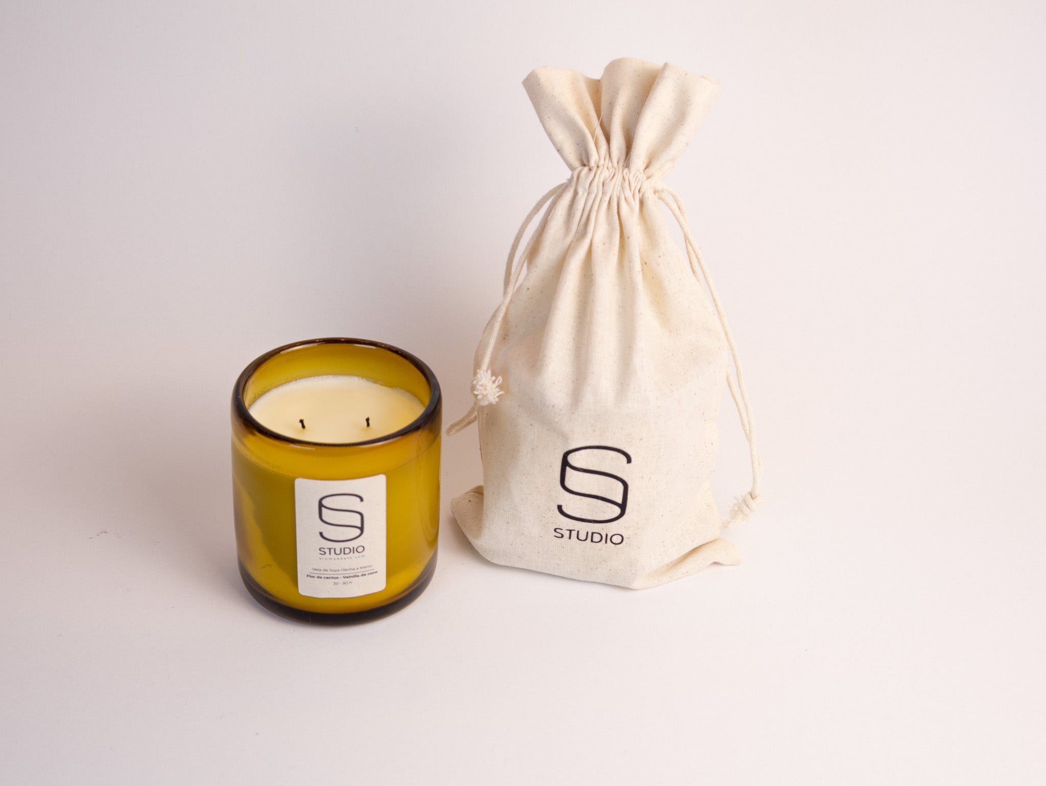Cada vela Studio llega lista para usarse y lucir: bolsa con logo, disco antipolvo, 2 pabilos naturales, fragancias curadas y cera de soya.